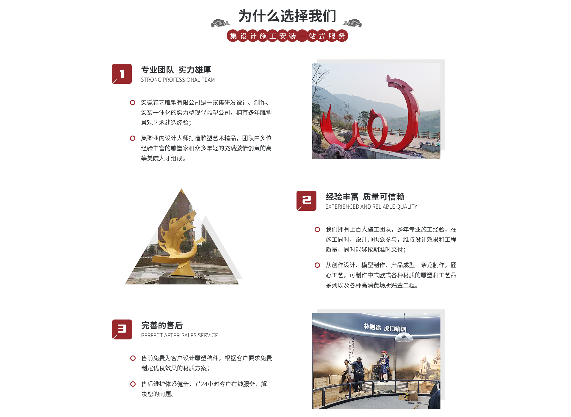 安徽鑫藝雕塑有限公司 是一家集研發(fā)設(shè)計(jì)、制作、安裝一體化的實(shí)力型現(xiàn)代雕塑公司。公司重視城市發(fā)展環(huán)境,追求空間與創(chuàng)意性建筑的結(jié)合,團(tuán)隊(duì)擁有眾多雕塑設(shè)計(jì)師。創(chuàng)作設(shè)計(jì)、模型制作、產(chǎn)品成型一條龍制作工藝,可制作中式、歐式各種材質(zhì)的雕塑和工藝品系列(砂巖、漢白玉、琉璃造型、樹脂透花等),以及各種高消費(fèi)場所貼金工程。業(yè)務(wù)區(qū)域:合肥雕塑公司、安徽浮雕公司、合肥浮雕制作、合肥雕塑制作、安徽雕塑制作、合肥雕塑廠、合...